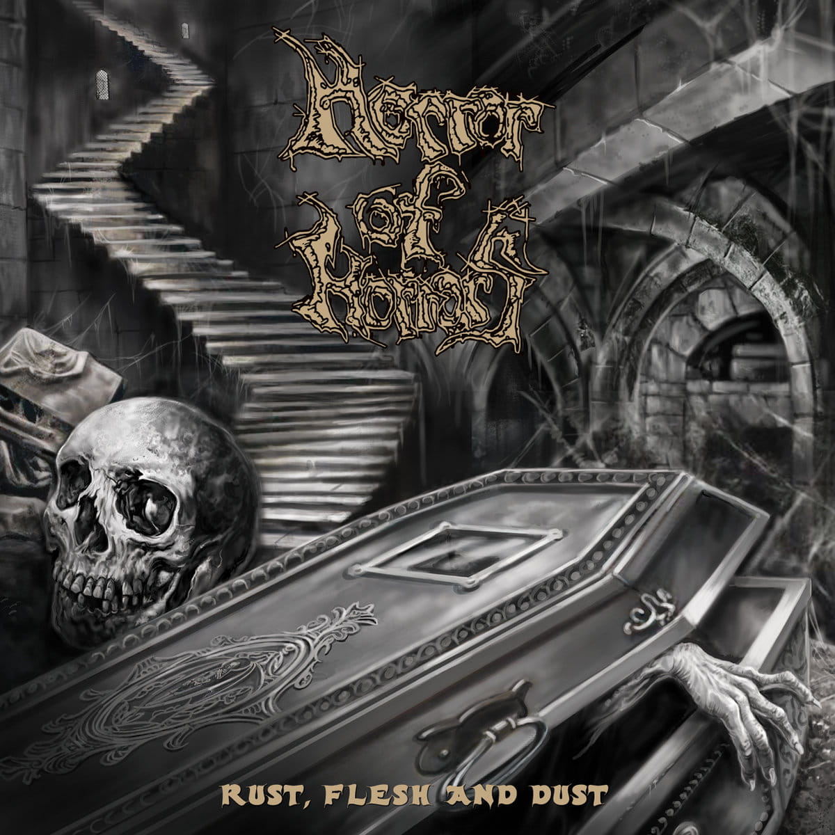 Horror Of Horrors (formed 1994), was a US death metal band and released three full lengths classic US death metal albums. Their 3rd ‘lost’ album was only digital released by the band in 2017 and never in any other format, nor artwork was made. Rust, Fles hand Dust was recorded at Mana Recording Studios, St. Petersburg, Florida in 2010. Mana Recording Studios is Eric Rutan’s studio where most of the Cannibal Corpse and Hate Eternal albums were recorded. ‘Rust, Flesh and Dust’ features Kevin Talley on drums (ex-Dying Fetus, ex-Misery Index, ex- Six Feet Under, ex-Suffocation), Kelly Mclauchlin on guitars (Pessimist, ex-Diabolic, ex-Hirax, ex-Possessed, ex-Unholy Ghost, ex-Angelcorpse (live), ex-I Am Morbid). And of course founding Horror of Horrors core members: H.M. Lopez on guitars and Buddy Buell on vocals and bass. Artwork made by Thoms Pinheiro (Hirax, Violence, Possessed). Remastered by Achilleas Kalantzis at Suncord Audiolab, December 2024 (Possessed, Varathron, Vio Lence).