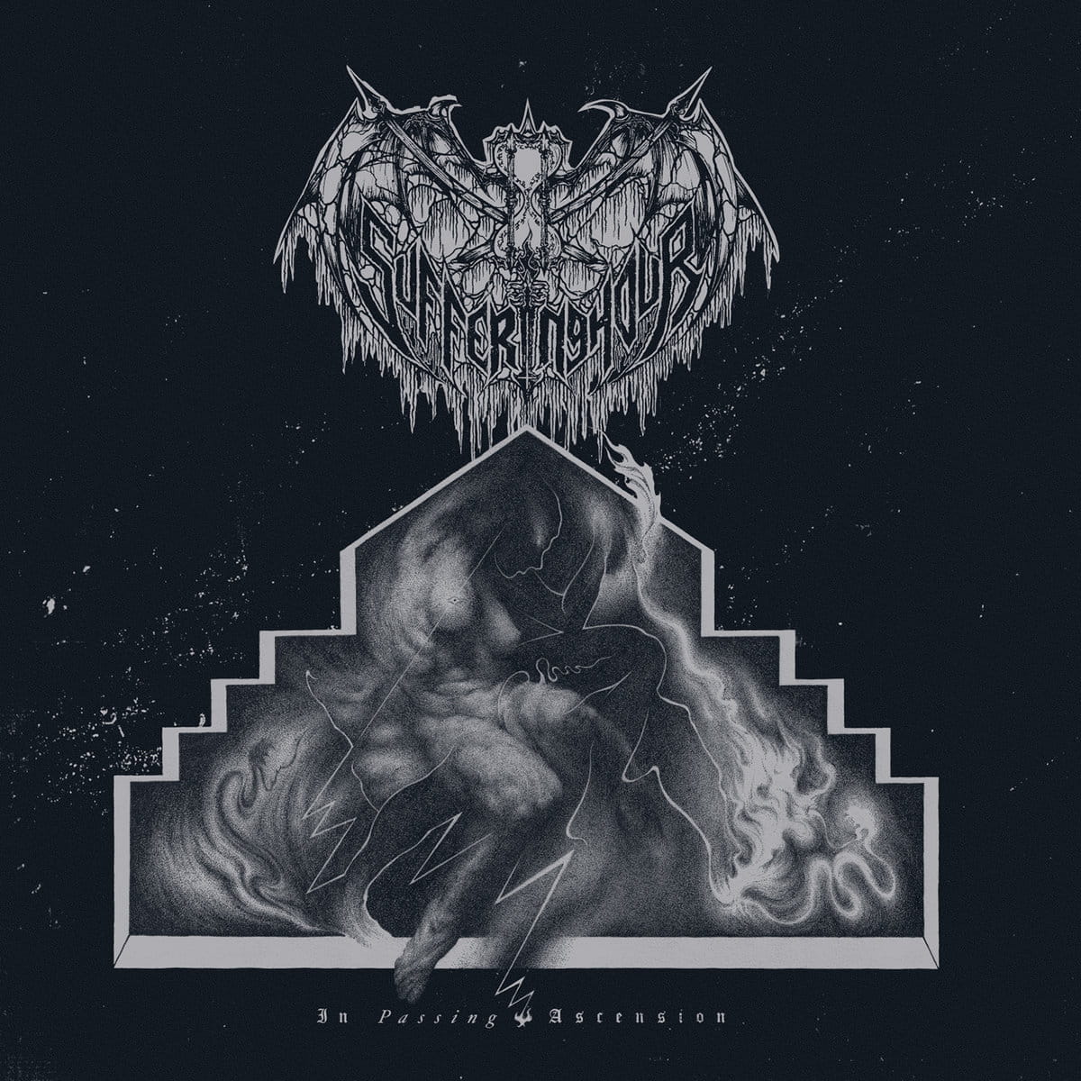 BLOOD HARVEST RECORDS is proud to present SUFFERING HOUR's highly anticipated debut album, In Passing Ascension. One of the most exciting new bands BLOOD HARVEST has had the pleasure of hearing, SUFFERING HOUR exhibit a power and maturity that exceeds their otherwise short existence. Theirs is a death metal that defies most modern paradigms, safely eluding prevailing trends whilst driving deep into the heart of timeless DEATH METAL art, evoking mysticism as surely as molten crush, songwriting class as surely as hideous chaos, with a serpentine flow like no other. As a title, In Passing Ascension is thus apt. There's something elusively transcendent about the sonic wormholes SUFFERING HOUR create here, something that sounds plucked effortlessly from the ether whilst being grounded in the dirt and grime and filth of the earth - and, surely, the foundation of death metal itself. It's a sensation of floating across suspended terra firma, as paradoxical as that may read on paper. For verily, SUFFERING HOUR have mastered the art of extremes: melodicism vs. miasma, space vs. swarm, tech vs. hypnosis, osmosis vs. disintegration, death metal as art vs. death metal as death metal. In Passing Ascension therefore is an experience in and of itself, a virtual world in which to roam (and perhaps get lost). With suitable (and suitably stirring) cover art created by Witchrist's Alexander Brown, In Passing Ascension shall soon be hailed as one of the year's mightiest death metal debuts. A statement from the band reads: "SUFFERING HOUR are proud to announce our allegiance with Swedish label BLOOD HARVEST. We will be releasing our debut album, In Passing Ascension, on CD and on black and colored wax. BLOOD HARVEST has done releases for some of our personal favorite bands, such as ALTARS, IMPETUOUS RITUAL, and ADVERSARIAL, just to name a few. We are extremely excited to be working with a label of this quality in every respect of the word, and we're 100% sure Rodrigo will be doing our album justice. In Passing Ascension is an album we have been working on since summer of 2014, and after years of hard work, we're ready to present the album to you all. The album is our take on cosmic blackened death metal, with themes deeply rooted in nihilism and cynicism. Some of the big influences on this album range from Inquisition and Mgla to The Chasm and Dead Congregation. There will be more news coming soon, so stay tuned."